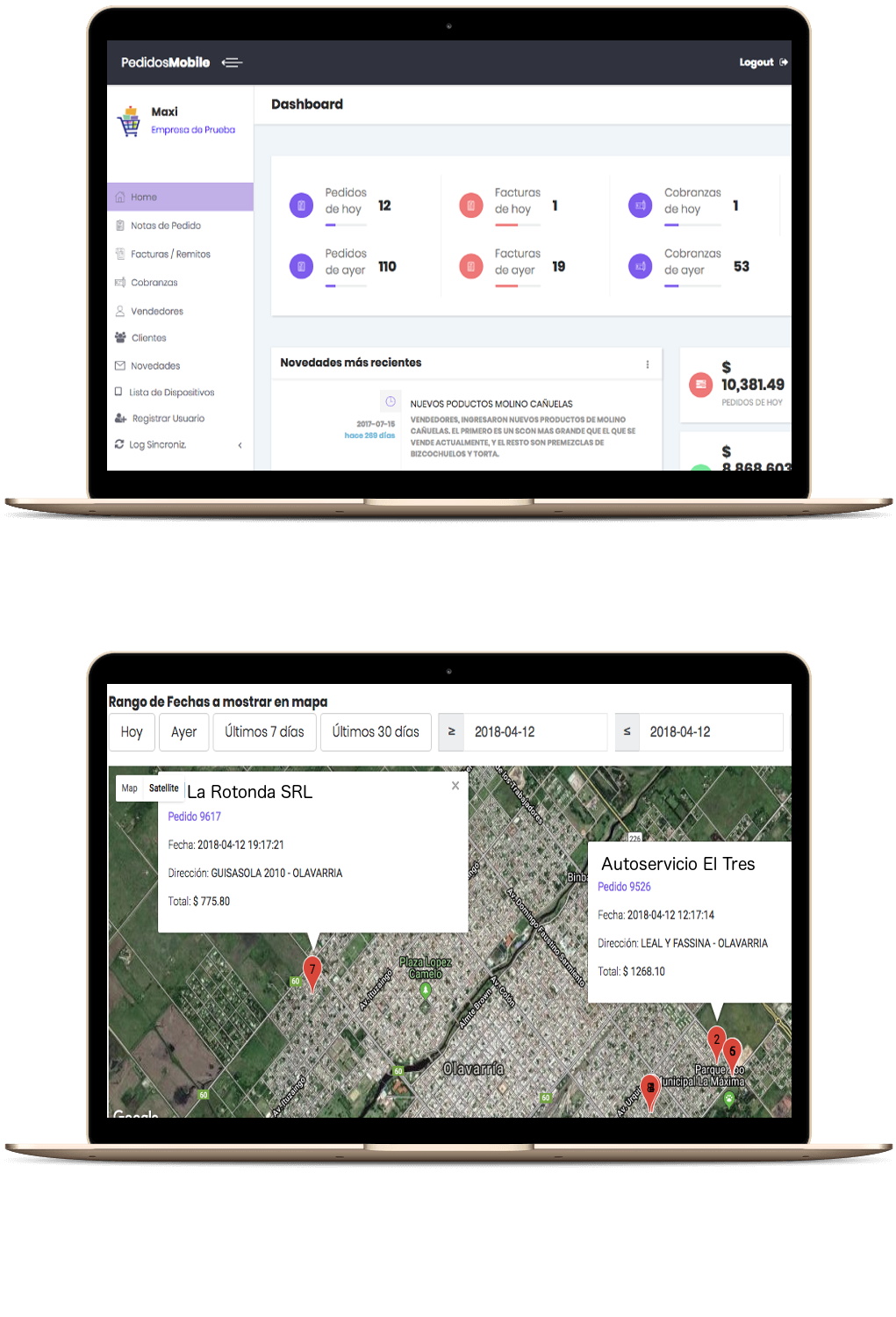 Permite registrar notas de pedido y cobranzas, enviar mensajes promociones y novedades a los vendedores, geo-localizar los Pedidos .